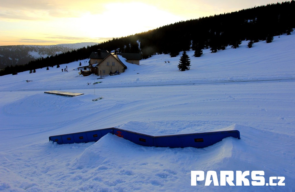 V parku nechybělo osm jibbovacích překážek, tři platformy se skoky v řadě za sebou, conner, velký butter box a spina ve tvaru sopky. Některé z překážek měli letos svou premiéru díky firmě PARKS.cz, která zajistila jejich výrobu a podílela se na stavbě celého snowparku. Jako novinku bych zmínila růžový rail hello killty, na kterém milá kočička donutila pověsit prádlo nejednoho ridera (zdravíme Frcína).