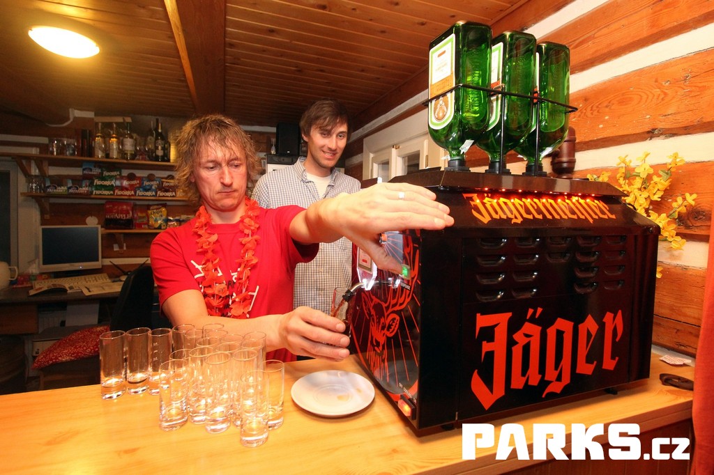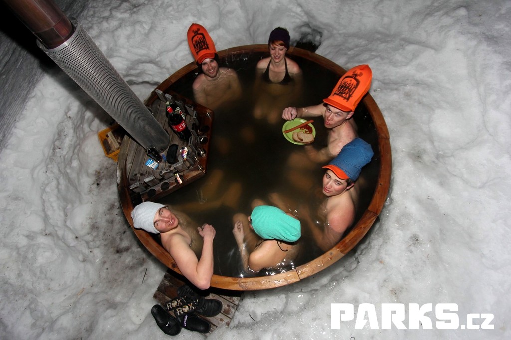 O zábavu se nám jako vždy staral náš dobrý kamarád namražený jelen Jägermeister se Zdendou za barem. K věčné smůle některých nebyl loňský rekord v nočním „kádění“ překonán a stále ho drží kemper, fotograf a především alkokouč Honza Burkert, který si loni střihnul něco přes sedm hodin. Letos byly v horké káďi k vidění především holky z Brna, které se s tím skutečně nepáraly. Po jednom z nejvydařenějších večerů končícím v sedm ráno si dal Joseph tu práci a sbíral kolem kádě zasněžené flašky, zmrzlé ručníky, tunu ponožek, svršků ba dokonce i jedněch spodků dámských plavek…. Bouchaly šáňa, padaly svině, však to znáte.